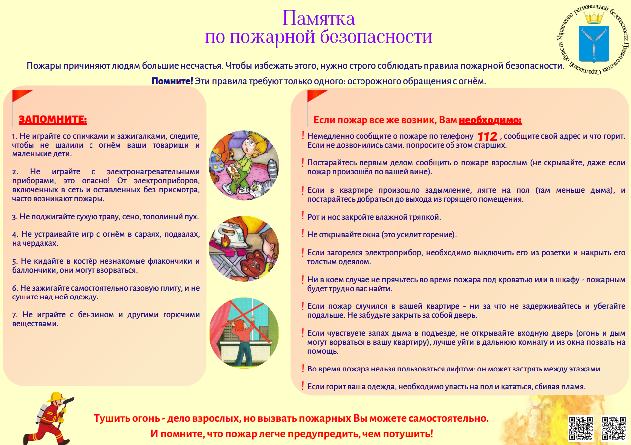 Правила пожарной безопасности следует прививать детям с малых лет! В целях безопасности необходимо как можно чаще беседовать с детьми о том, как себя вести в чрезвычайных ситуациях, разъясняя им возможные последствия и опасность игр с огнем и другими пожароопасными предметами. Практика показывает, что там, где среди детей проводится разъяснительная работа, направленная на предупреждение пожаров от детской шалости с огнем, опасность возникновения пожаров по этой причине сводится к минимуму.